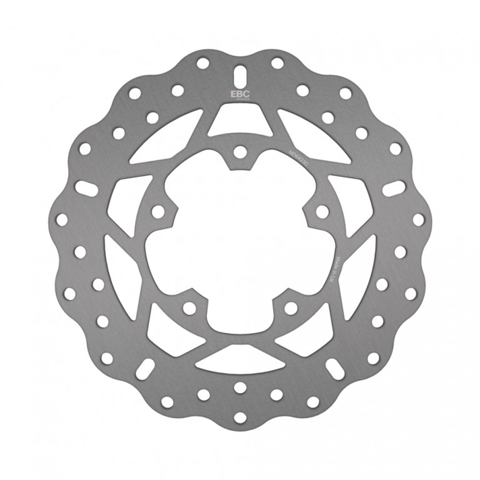 Brzdový kotouč EBC z nerezové oceli, navržený pro maximální brzdný výkon a spolehlivost, kompatibilní jako náhrada za originální kotouče.