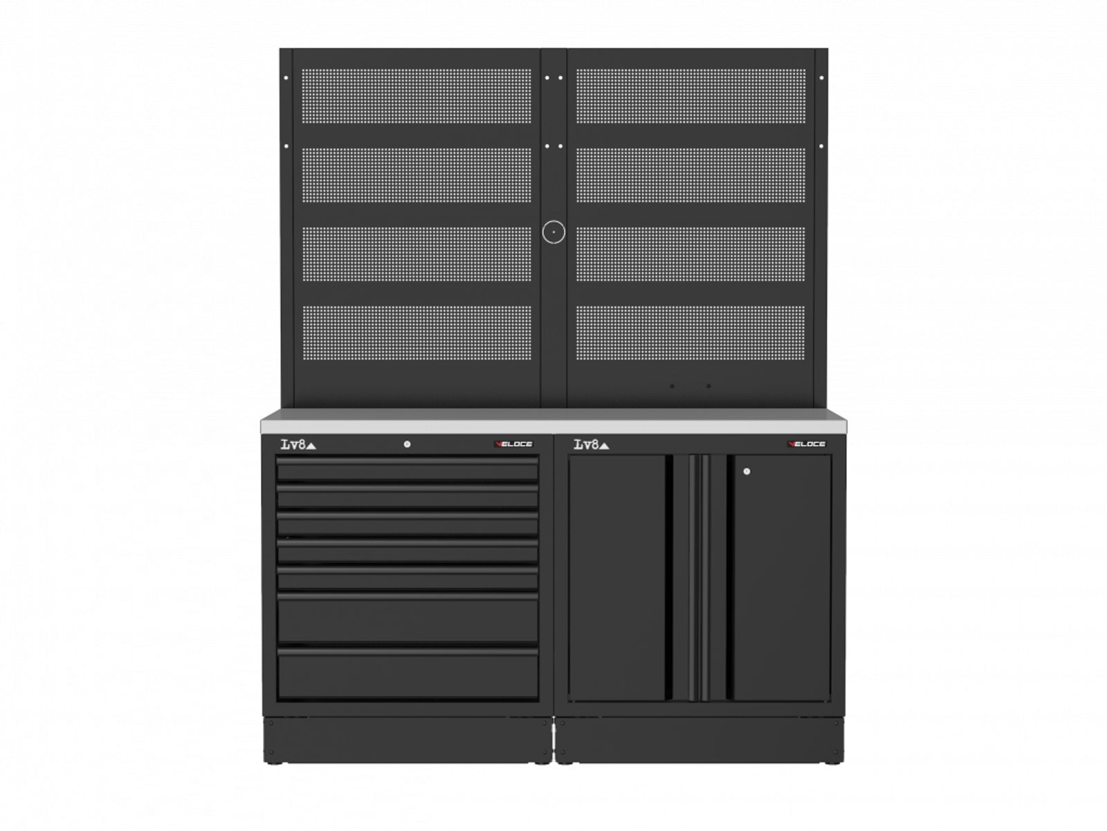 Pracovní stůl délky 1600 mm s 7 zásuvkovou skříňkou a dvoudveřovou skříňkou s nastavitelnou policí a zámkem. Masivní dřevěná pracovní deska, dvojitý perforovaný panel na nářadí a příprava pro elektrickou zásuvku. K dispozici také v provedení s nerezovou nebo melaminovou deskou.