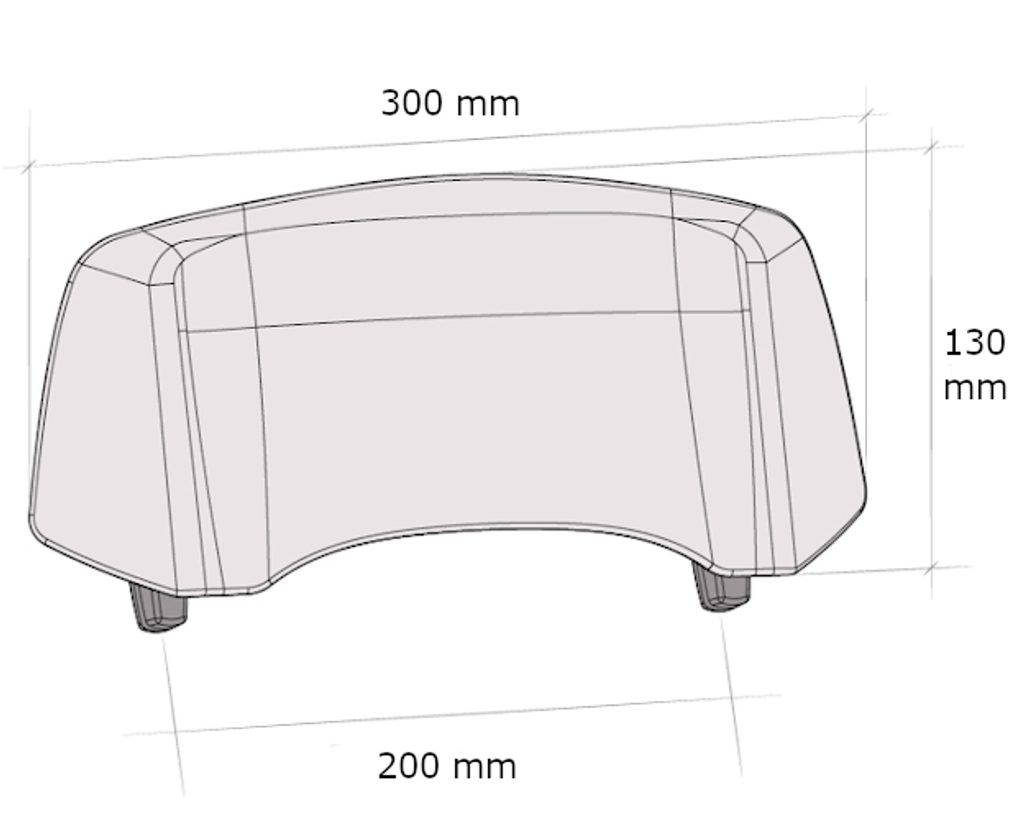 Rozměry hledí jsou 300 mm šířka x 130 mm výška, se vzdáleností mezi úchyty 200 mm, aby nerušilo výhled skrz.