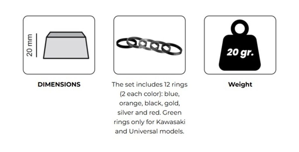 UPOZORNĚNÍ: The set includes 12 rings (2 each color): blue, orange, black, gold, silver and red.